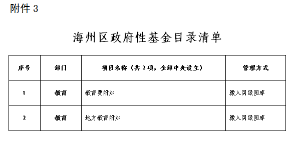 现公布《海州区行政事业性收费目录清单》、《海州区涉企行政事业性收费目录清单》和《海州区政府性基金目录清单》。目录清单之外的行政事业性收费和政府性基金,一律不得执行,公民、法人和其他组织有权拒绝缴纳。执行中行政事业性收费和政府性基金项目发生变化,海州区财政局将结合国家有关要求及时更新目录清单内容。