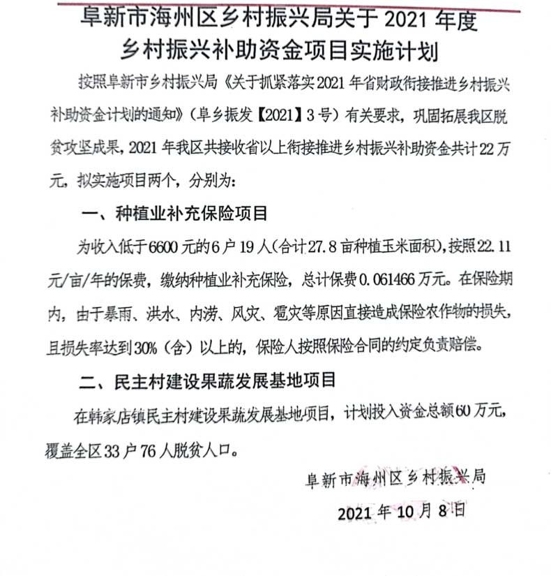 阜新市海州区乡村振兴局关于2021年度乡村振兴补助资金项目实施计划