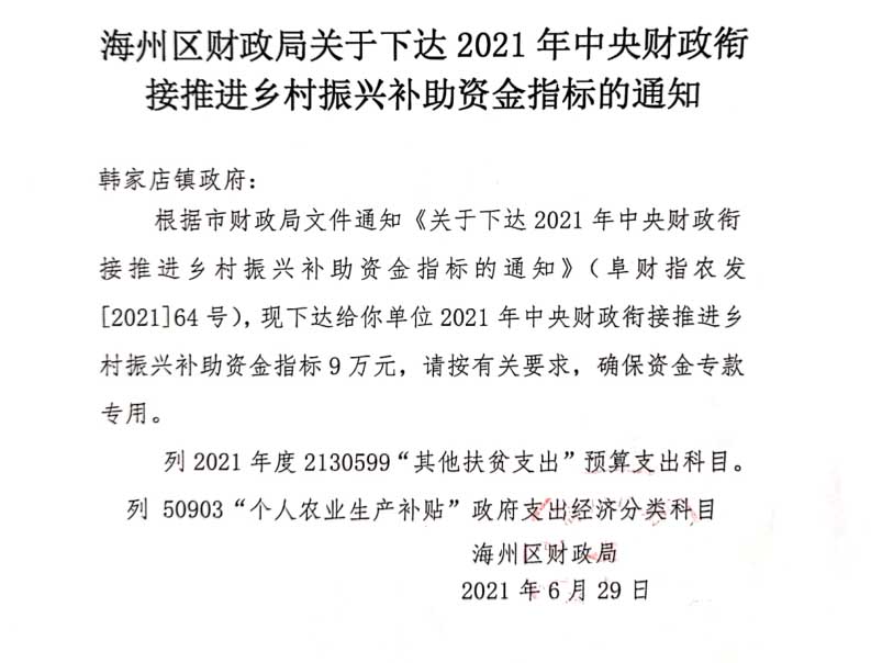 海州区财政局关于下达2021年中央财政衔接推进乡村振兴补助资金指标的通知