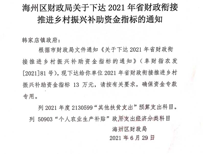 海州区财政局关于下达2021年省财政衔接推进乡村振兴补助资金指标的通知
