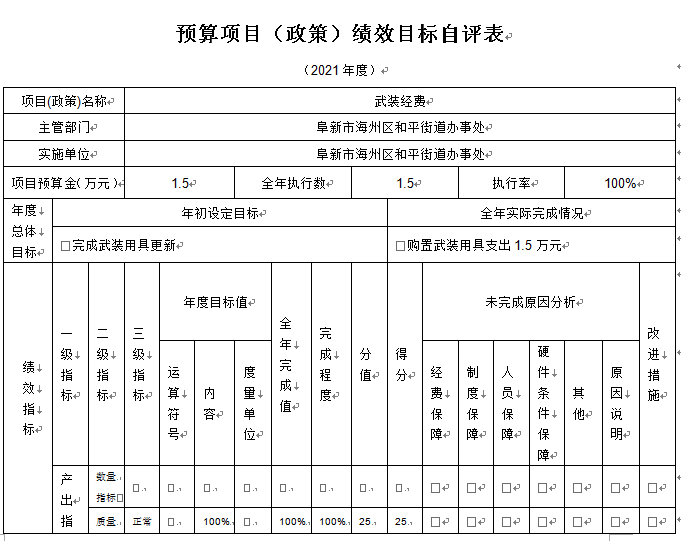 (1)“武装经费”项目自评综述:根据年初设定的绩效目标,项目自评得分100分。项目全年预算数为1.5万元,执行数为1.5万元,完成预算的100%。项目绩效目标完成情况:一是产出指标全部完成;二是效益指标全部完成;三是满意度指标全部完成。发现的主要问题及原因:一是预算执行进度和效率有待加强;二是绩效目标管理和调整有待完善。下一步改进措施:一是切实加快预算执行进度,提升资金使用效率;二是密切关注目标任务开展情况,确保实际工作切合绩效目标。