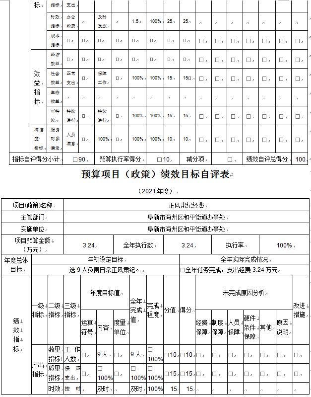 (2)“正风肃纪经费”项目自评综述:根据年初设定的绩效目标,项目自评得分100分。项目全年预算数为3.24万元,执行数为3.24万元,完成预算的100%。项目绩效目标完成情况:一是产出指标全部完成;二是效益指标全部完成;三是满意度指标全部完成。发现的主要问题及原因:一是预算执行进度和效率有待加强;二是绩效目标管理和调整有待完善。下一步改进措施:一是切实加快预算执行进度,提升资金使用效率;二是密切关注目标任务开展情况,确保实际工作切合绩效目标。