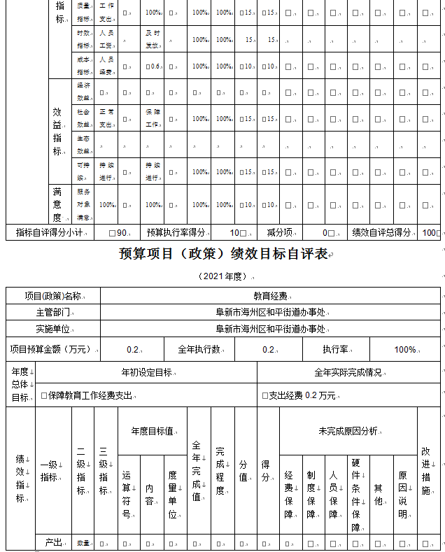 (4)“教育经费”项目自评综述:根据年初设定的绩效目标,项目自评得分100分。项目全年预算数为0.20万元,执行数为0.20万元,完成预算的100%。项目绩效目标完成情况:一是产出指标全部完成;二是效益指标全部完成;三是满意度指标全部完成。发现的主要问题及原因:一是预算执行进度和效率有待加强;二是绩效目标管理和调整有待完善。下一步改进措施:一是切实加快预算执行进度,提升资金使用效率;二是密切关注目标任务开展情况,确保实际工作切合绩效目标。