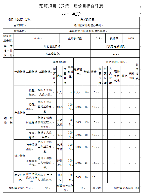 (1)“关工委经费”项目自评综述:根据年初设定的绩效目标,项目自评得分90分。项目全年预算数为0.6万元,执行数为0.6万元,完成预算的100%。项目绩效目标完成情况:一是按时完成;二是及时发放;三是保障正常工作。发现的主要问题及原因:一是预算执行进度和效率有待加强;二是绩效目标管理和调整有待完善。下一步改进措施:一是切实加快预算执行进度,提升资金使用效率;二是密切关注目标任务开展情况,确保实际工作切合绩效目标。