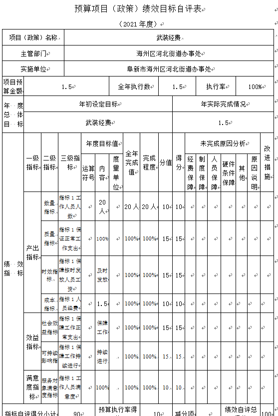 (3)“武装经费”项目自评综述:根据年初设定的绩效目标,项目自评得分90分。项目全年预算数为1.5万元,执行数为1.5万元,完成预算的100%。项目绩效目标完成情况:一是按时完成;二是及时发放;三是保障正常工作。发现的主要问题及原因:一是预算执行进度和效率有待加强;二是绩效目标管理和调整有待完善。下一步改进措施:一是切实加快预算执行进度,提升资金使用效率;二是密切关注目标任务开展情况,确保实际工作切合绩效目标。