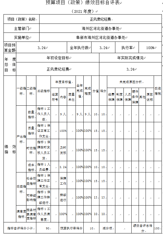 (4)“正风肃纪经费”项目自评综述:根据年初设定的绩效目标,项目自评得分90分。项目全年预算数为3.24万元,执行数为3.24万元,完成预算的100%。项目绩效目标完成情况:一是按时完成;二是及时发放;三是保障正常工作。发现的主要问题及原因:一是预算执行进度和效率有待加强;二是绩效目标管理和调整有待完善。下一步改进措施:一是切实加快预算执行进度,提升资金使用效率;二是密切关注目标任务开展情况,确保实际工作切合绩效目标。