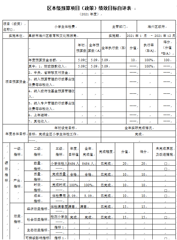 (1)“小学生体检费”项目自评综述:根据年初设定的绩效目标,项目自评得分100分。项目全年预算数为5.09万元,执行数为5.09万元,完成预算的100%。项目绩效目标完成情况:一是完成小学生体检8484人;二是保质保量完成体检工作;三是服务对象满意。发现的主要问题及原因:一是财务管理制度执行力偏弱;二是财务管理监督措施有待加强。下一步改进措施:一是加强资金预算编制;二是加强绩效管理分析。