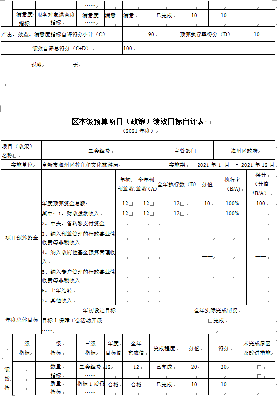 (2)“工会经费”项目自评综述:根据年初设定的绩效目标,项目自评得分100分。项目全年预算数为12.00万元,执行数为12.00万元,完成预算的100%。项目绩效目标完成情况:一是完成工会经费拨付;二是完成工会活动开展;三是工会会员满意。发现的主要问题及原因:一是财务管理制度执行力偏弱;二是财务管理监督措施有待加强。下一步改进措施:一是加强资金预算编制;二是加强绩效管理分析。