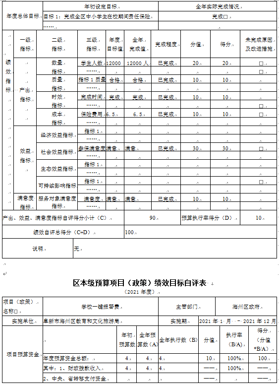 (4)“学校一键报警费”项目自评综述:根据年初设定的绩效目标,项目自评得分100分。项目全年预算数为4万元,执行数为4万元,完成预算的100%。项目绩效目标完成情况:一是一键报警公办校、园全覆盖;二是按时拨付一键报警经费;三是公办校、园满意。发现的主要问题及原因:一是财务管理制度执行力偏弱;二是财务管理监督措施有待加强。下一步改进措施:一是加强资金预算编制;二是加强绩效管理分析。