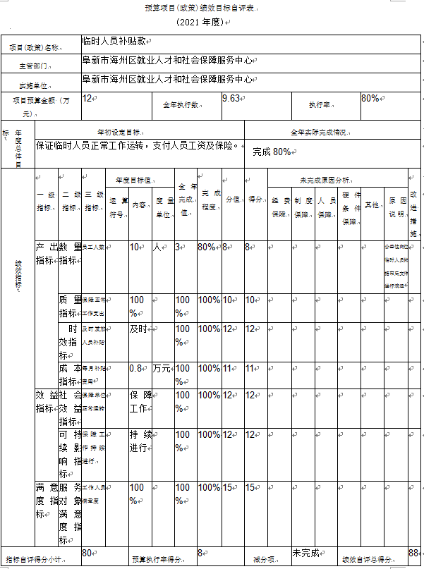 (1)“临时人员补贴款”项目自评综述:根据年初设定的绩效目标,项目自评得分8分。项目全年预算数为12万元,执行数为9.63万元,完成预算的80%。项目绩效目标完成情况:一是产出指标41分;二是效益指标24分;三是满意度指标15分;四是预算资金执行率8分。发现的主要问题及原因:未完成项目的主要原因为2021年4月公益性岗位临时人员依据市局文件规定清退,致使未完成绩效目标。下一步改进措施:加强预算重视程度,提高预算准确度。