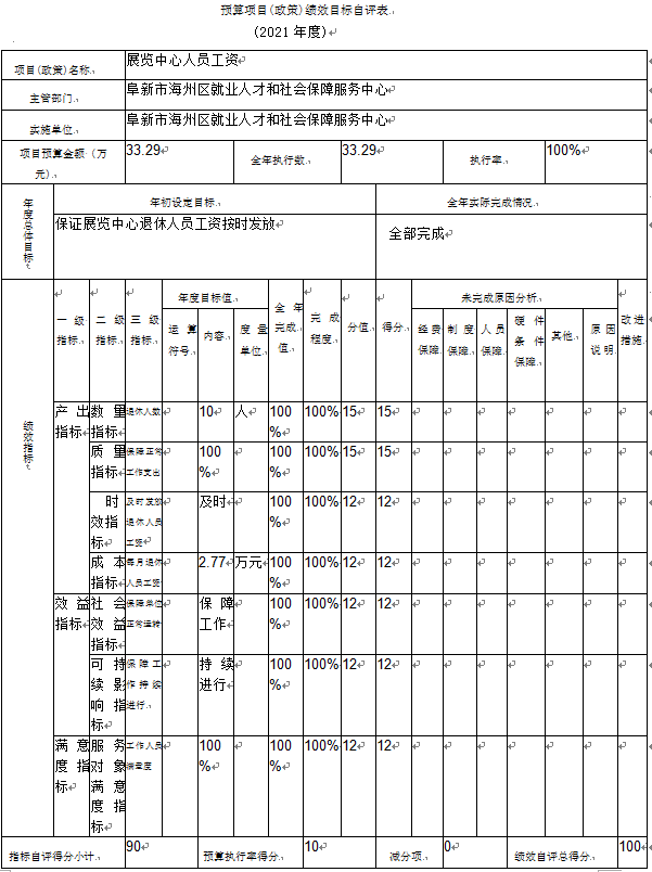 (2)“展览中心人员工资”项目自评综述:根据年初设定的绩效目标,项目自评得分10分。项目全年预算数为33.29万元,执行数为33.29万元,完成预算的100%。项目绩效目标完成情况:一是产出指标54分;二是效益指标24分;三是满意度指标12分;四是预算资金执行率10分。发现的主要问题及原因:预算编制的准确度欠缺,其主要原因是没有及时掌握预算环境的变化情况。下一步改进措施:优化预算管理制度,提高业务部门对预算的参与度及重视程度,做好年度预算的计划工作,监督工作。