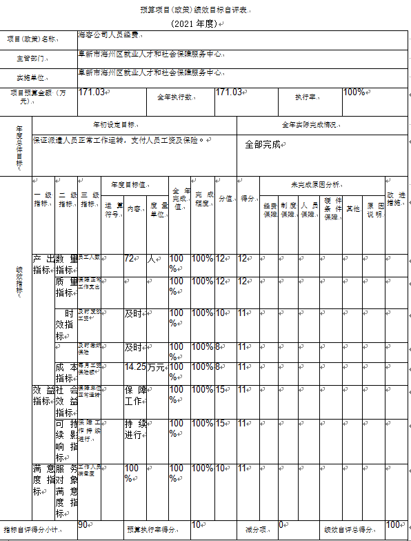 (3)“海容公司人员经费”项目自评综述:根据年初设定的绩效目标,项目自评得分10分。项目全年预算数为171.03万元,执行数为171.03万元,完成预算的100%。项目绩效目标完成情况:一是产出指标57分;二是效益指标22分;三是满意度指标11分;四是预算资金执行率10分。发现的主要问题及原因:预算编制的准确度欠缺,其主要原因是没有及时掌握预算环境的变化情况。下一步改进措施:优化预算管理制度,提高业务部门对预算的参与度及重视程度,做好年度预算的计划工作,监督工作。