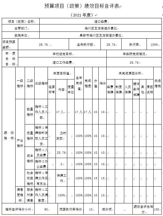 (1)“道口经费”项目自评综述:根据年初设定的绩效目标,项目自评得分90分。项目全年预算数为28.76万元,执行数为28.76万元,完成预算的100%。项目绩效目标完成情况:一是按时完成;二是及时发放;三是保障正常工作。发现的主要问题及原因:一是预算执行进度和效率有待加强;二是绩效目标管理和调整有待完善。下一步改进措施:一是切实加快预算执行进度,提升资金使用效率;二是密切关注目标任务开展情况,确保实际工作切合绩效目标。