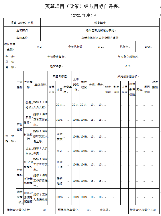 (3)“教育经费”项目自评综述:根据年初设定的绩效目标,项目自评得分90分。项目全年预算数为0.2万元,执行数为0.2万元,完成预算的100%。项目绩效目标完成情况:一是按时完成;二是及时发放;三是保障正常工作。发现的主要问题及原因:一是预算执行进度和效率有待加强;二是绩效目标管理和调整有待完善。下一步改进措施:一是切实加快预算执行进度,提升资金使用效率;二是密切关注目标任务开展情况,确保实际工作切合绩效目标。