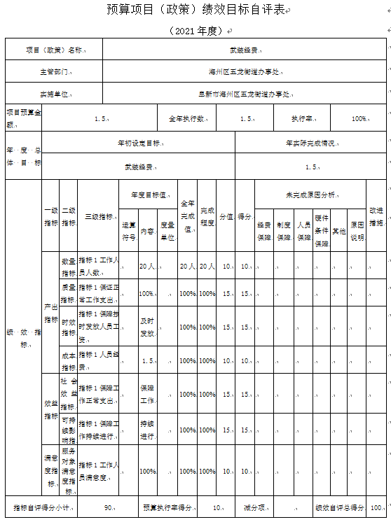 (4)“武装经费”项目自评综述:根据年初设定的绩效目标,项目自评得分90分。项目全年预算数为1.5万元,执行数为1.5万元,完成预算的100%。项目绩效目标完成情况:一是按时完成;二是及时发放;三是保障正常工作。发现的主要问题及原因:一是预算执行进度和效率有待加强;二是绩效目标管理和调整有待完善。下一步改进措施:一是切实加快预算执行进度,提升资金使用效率;二是密切关注目标任务开展情况,确保实际工作切合绩效目标。