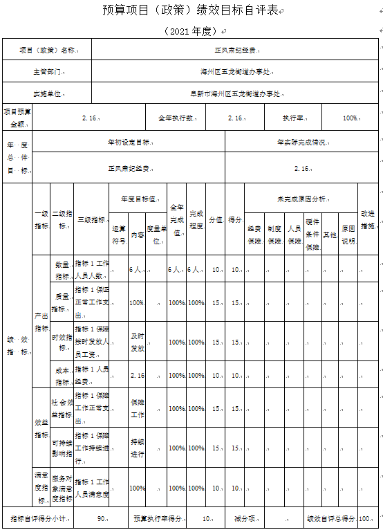 (5)“正风肃纪经费”项目自评综述:根据年初设定的绩效目标,项目自评得分90分。项目全年预算数为2.16万元,执行数为2.16万元,完成预算的100%。项目绩效目标完成情况:一是按时完成;二是及时发放;三是保障正常工作。发现的主要问题及原因:一是预算执行进度和效率有待加强;二是绩效目标管理和调整有待完善。下一步改进措施:一是切实加快预算执行进度,提升资金使用效率;二是密切关注目标任务开展情况,确保实际工作切合绩效目标。