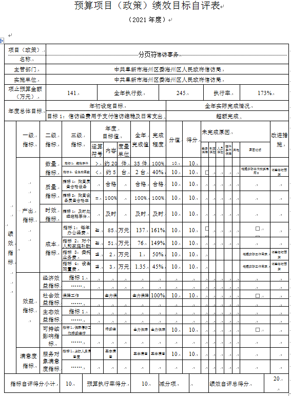 “信访事务”项目自评综述:根据年初设定的绩效目标,项目自评得分100分。项目全年预算数为141万元,执行数为245万元,完成预算的173%。项目绩效目标完成情况:区委区政府信访局因国家重要节点及突发临时性值班接访任务多,办公经费超出预算指标,对个人和家庭救助、委托业务费和设备购置费匀在指标范围内。