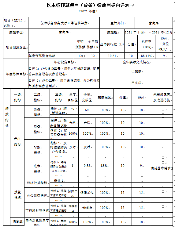 “保障政务服务大厅正常运转经费”项目自评综述:根据年初设定的绩效目标,项目自评得分98分。项目全年预算数为12万元,执行数为10.61万元,完成预算的88%。项目绩效目标完成情况:一是办公设备经费已完成,二是办公经费已完成。发现的主要问题及原因:一是预算执行进度和效率有待加强;二是绩效目标管理和调整有待完善。下一步改进措施:一是切实加快预算执行进度,提升资金使用效率。二是密切关注目标任务开展情况,确保实际工作切合绩效目标。