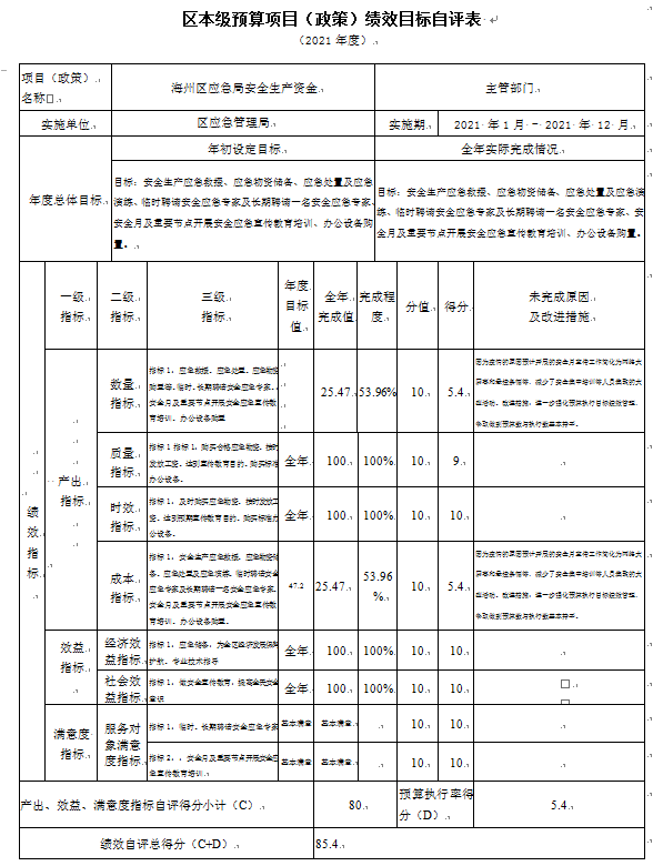 “海州区应急局安全生产资金”项目自评综述:根据年初设定的绩效目标,项目自评得分85.4分。项目全年预算数为47.2万元,执行数为25.47万元,完成预算的53.96%。项目绩效目标完成情况:项目资金均按照项目的使用范围和用途进行支出,绩效目标较好的完成,达到了预期的效果。发现的主要问题及原因:本年度项目预算与全年执行数差额较大,主要是因为疫情的原因预计开展的安全月宣传工作简化为网络大屏幕和悬挂条幅等,减少了安全集中培训和大型应急演练等人员集聚的大型活动。下一步改进措施:进一步强化预算执行目标绩效管理,争取做到预算数与执行数基本持平。为保证项目资金规范使用,区应急管理局将根据预算资金的总量、方向及实际工作情况,对批复到位的项目资金做好精细核算,切实做到专款专用,实现资金使用效率最优化,完善单位《财务管理制度》及《经费管理办法》,为专项资金的使用管理提供制度保障。