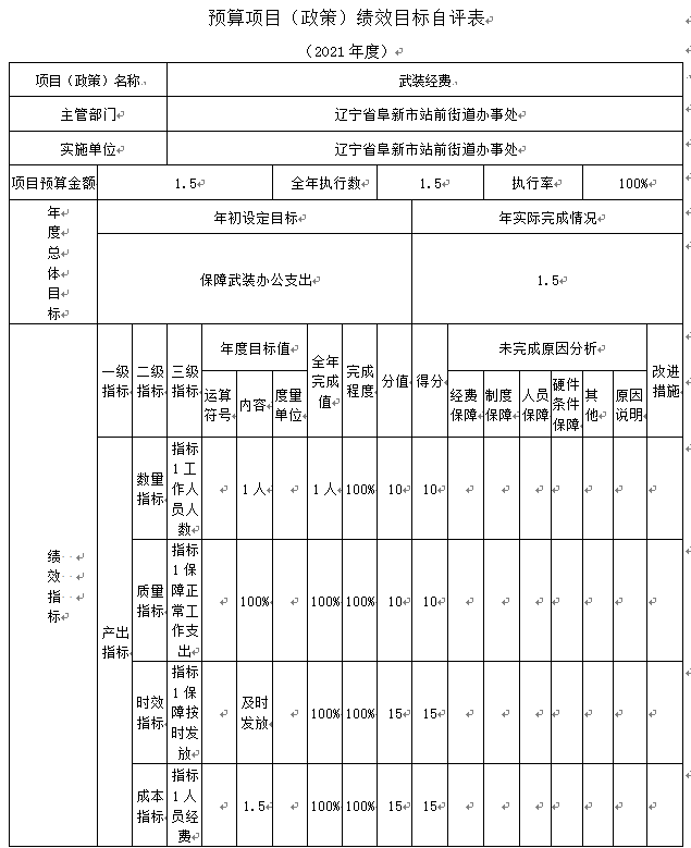 (2)“武装经费”项目自评综述:根据年初设定的绩效目标,项目自评得分100分。项目全年预算数为1.5万元,执行数为1.5万元,完成预算的100%。项目绩效目标完成情况:一是按时完成;二是及时发放;三是保障正常工作。发现的主要问题及原因:一是预算执行进度和效率有待加强;二是绩效目标管理和调整有待完善。下一步改进措施:一是切实加快预算执行进度,提升资金使用效率;二是密切关注目标任务开展情况,确保实际工作切合绩效目标。
