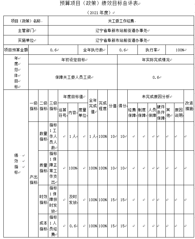 (3)“关工委工作经费”项目自评综述:根据年初设定的绩效目标,项目自评得分100分。项目全年预算数为0.6万元,执行数为0.6万元,完成预算的100%。项目绩效目标完成情况:一是按时完成;二是及时发放;三是保障正常工作。发现的主要问题及原因:一是预算执行进度和效率有待加强;二是绩效目标管理和调整有待完善。下一步改进措施:一是切实加快预算执行进度,提升资金使用效率;二是密切关注目标任务开展情况,确保实际工作切合绩效目标。