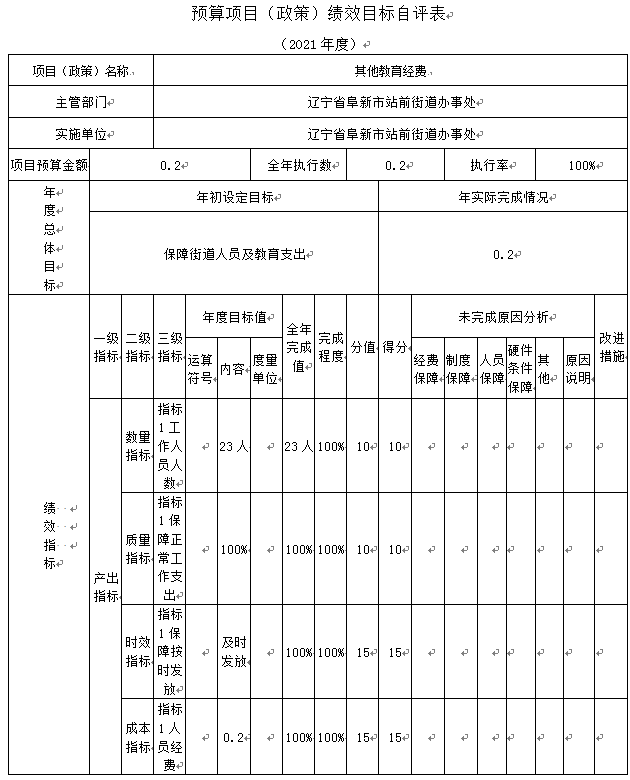 (4)“其他教育经费”项目自评综述:根据年初设定的绩效目标,项目自评得分100分。项目全年预算数为0.2万元,执行数为0.2万元,完成预算的100%。项目绩效目标完成情况:一是按时完成;二是及时发放;三是保障正常工作。发现的主要问题及原因:一是预算执行进度和效率有待加强;二是绩效目标管理和调整有待完善。下一步改进措施:一是切实加快预算执行进度,提升资金使用效率;二是密切关注目标任务开展情况,确保实际工作切合绩效目标。