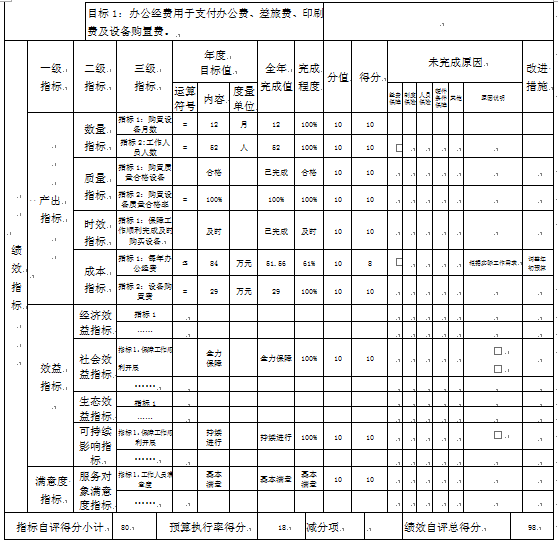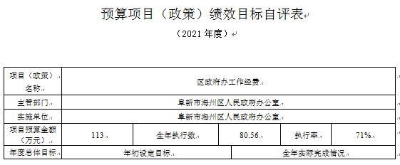 “区政府办工作经费”项目自评综述:根据年初设定的绩效目标,项目自评得分98分。项目全年预算数为113万元,执行数为80.56万元,完成预算的71%。项目绩效目标完成情况:一是按时完成;二是保障正常工作。发现的主要问题及原因:一是预算执行进度和效率有待加强;二是绩效目标管理和调整有待完善。下一步改进措施:一是切实加快预算执行进度,提升资金使用效率。二是密切关注目标任务开展情况,确保实际工作切合绩效目标。