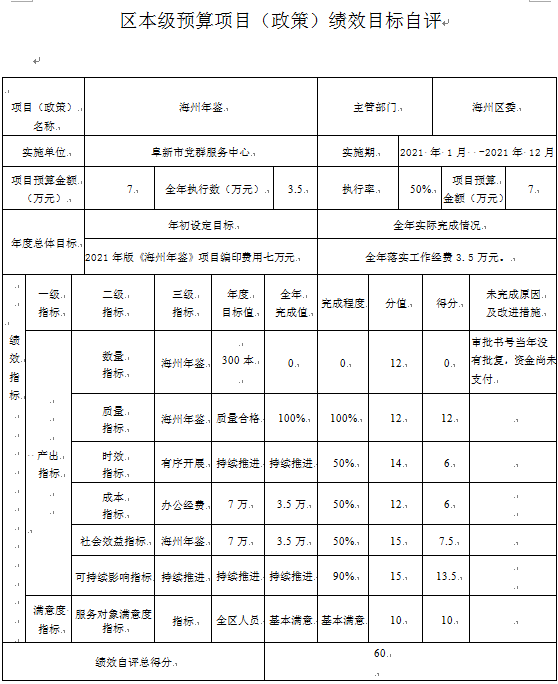 (1)绩效自评情况。根据预算绩效管理要求,我部门组织对2021年度预算项目支出全面开展绩效自评,共涉及预算支出项目1个,涉及资金7万元,自评覆盖率(开展绩效自评的项目数/年初批复绩效目标的项目数)达到100%,自评平均分(开展绩效自评的项目分数总和/开展绩效自评的项目数)60分。