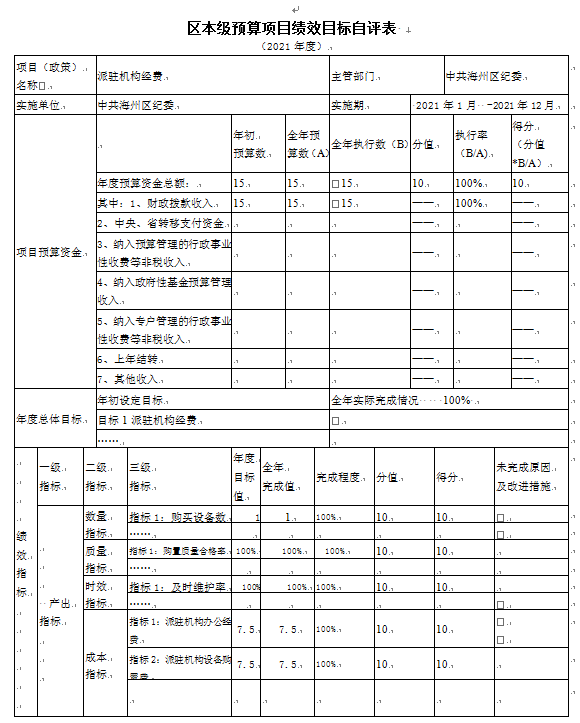 (2)“派驻机构经费”项目自评综述:根据年初设定的绩效目标,项目自评得分100分。项目全年预算数为15万元,执行数为15万元,完成预算的100%。项目绩效目标完成情况:派驻机构经费绩效自评总得分100分。产出指标得分50分,效益指标得分30分,满意度指标得分10分,预算资金执行率得分10分。发现的主要问题及原因:财务管理制度执行力度薄弱,财务管理监督措施有待加强。下一步改进措施:加强指导海州区纪委进行资金预算编制及绩效管理分析。
