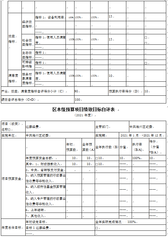 (3)“巡察经费”项目自评综述:根据年初设定的绩效目标,项目自评得分100分。项目全年预算数为10万元,执行数为10万元,完成预算的100%。项目绩效目标完成情况:巡察经费绩效自评总得分100分。产出指标得分50分,效益指标得分30分,满意度指标得分10分,预算资金执行率得分10分。发现的主要问题及原因:财务管理制度执行力度薄弱,财务管理监督措施有待加强。下一步改进措施:加强指导海州区纪委进行资金预算编制及绩效管理分析。