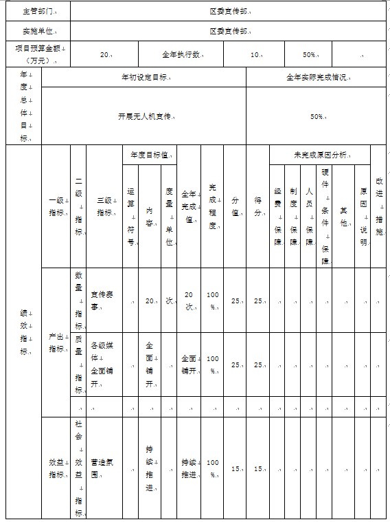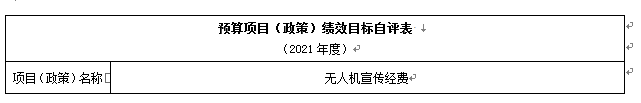 (1)“无人机宣传经费”项目自评综述:根据年初设定的绩效目标,项目自评得分94分。项目全年预算数为20万元,执行数为10万元,完成预算的50%。项目绩效目标完成情况:一是宣传赛事20次完成程度100%;二是各级媒体全面铺开完成程度100%。