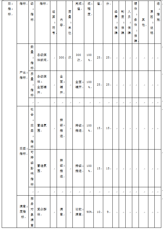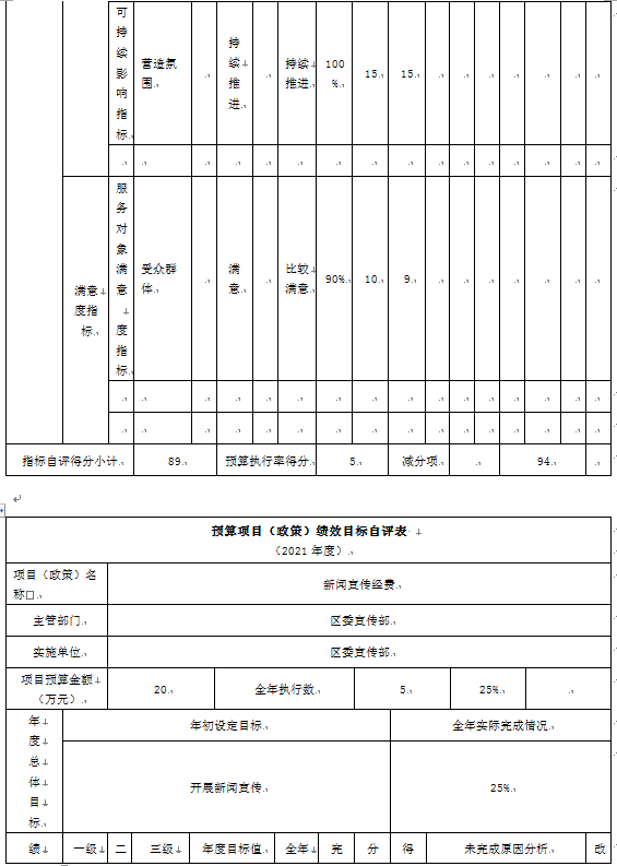 (2)“新闻宣传经费”项目自评综述:根据年初设定的绩效目标,项目自评得分92分。项目全年预算数为20万元,执行数为5万元,完成预算的25%。项目绩效目标完成情况:一是各级新闻媒体300次完成程度100%;二是各级媒体全面铺开完成程度100%。