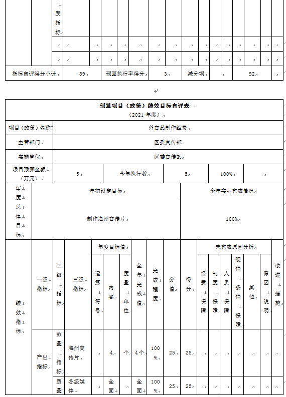 (3)“外宣品制作经费”项目自评综述:根据年初设定的绩效目标,项目自评得分100分。项目全年预算数为5万元,执行数为5万元,完成预算的100%。项目绩效目标完成情况:一是海州宣传片4个完成程度100%;二是各级媒体全面铺开完成程度100%。