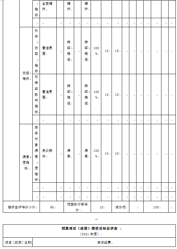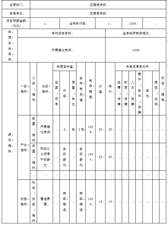 (4)“宣讲经费”项目自评综述:根据年初设定的绩效目标,项目自评得分100分。项目全年预算数为1万元,执行数为1万元,完成预算的100%。项目绩效目标完成情况:一是开展理论宣讲2场完成程度100%;二是科级以上领导干部全部参加完成程度100%。