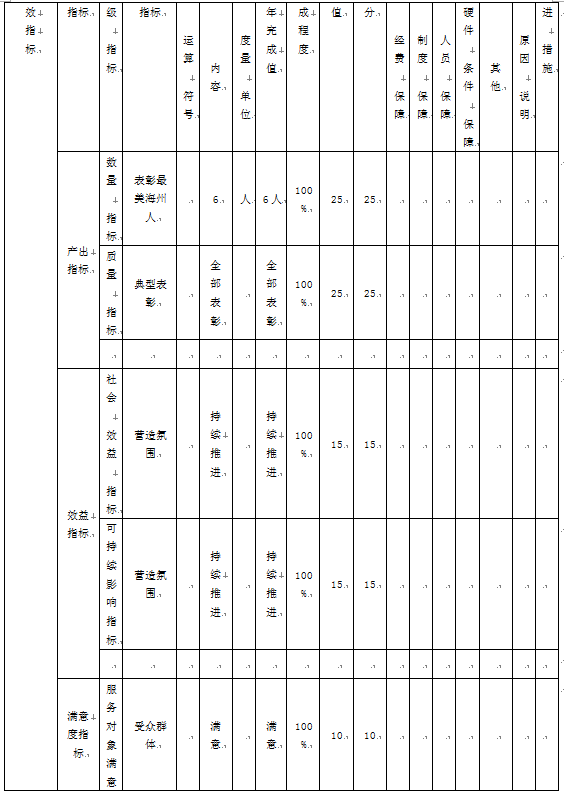 (5)“典型经费”项目自评综述:根据年初设定的绩效目标,项目自评得分100分。项目全年预算数为1万元,执行数为1万元,完成预算的100%。项目绩效目标完成情况:一是最美海州人6人完成程度100%;二是典型全部完成程度100%。