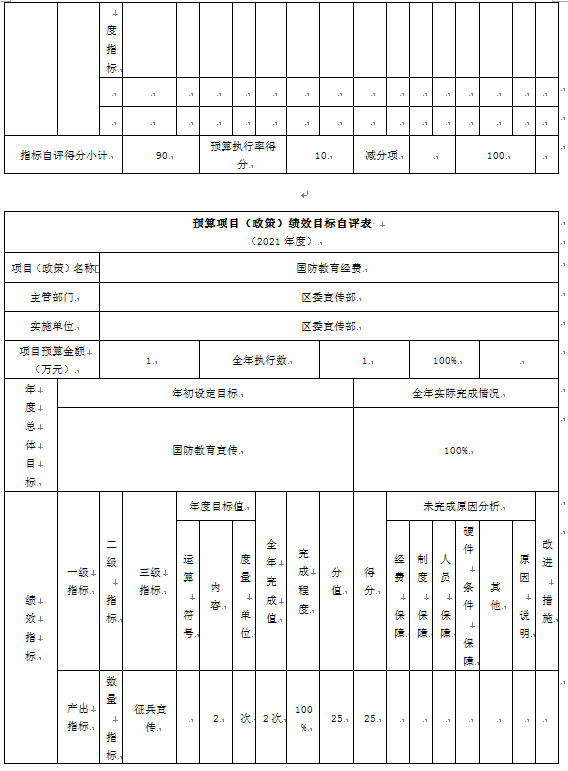 (6)“国防教育经费”项目自评综述:根据年初设定的绩效目标,项目自评得分100分。项目全年预算数为1万元,执行数为1万元,完成预算的100%。项目绩效目标完成情况:一是征兵宣传2次完成程度100%;二是各级媒体全面铺开完成程度100%。