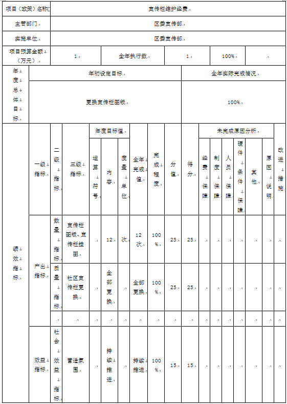 (7)“宣传栏维护经费”项目自评综述:根据年初设定的绩效目标,项目自评得分100分。项目全年预算数为1万元,执行数为1万元,完成预算的100%。项目绩效目标完成情况:一是宣传图版12次完成程度100%;二是社区宣传栏全部更换完成程度100%。