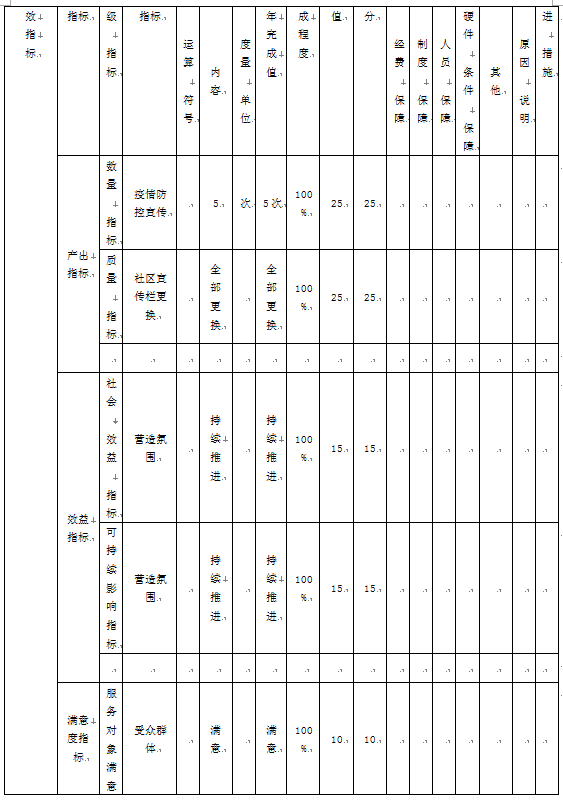 (8)“疫情宣传经费”项目自评综述:根据年初设定的绩效目标,项目自评得分100分。项目全年预算数为1万元,执行数为1万元,完成预算的100%。项目绩效目标完成情况:一是疫情防控宣传5次完成程度100%;二是社区宣传栏全部更换完成程度100%。