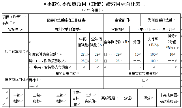 “政法委事务”项目自评综述:根据年初设定的绩效目标,项目自评得分100分。项目全年预算数为28万元,执行数为28万元,完成预算的100%。项目绩效目标完成情况:区委政法委因国家重要节点及突发临时性值班接访任务多,办公经费超出预算指标,对个人和家庭救助、委托业务费和设备购置费匀在指标范围内。