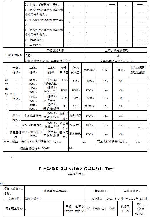 (1)“政协会议费”项目自评综述:根据年初设定的绩效目标,项目自评得分92分。项目全年预算数为18万元,执行数为9.68万元,完成预算的53.78%。项目绩效目标完成情况:2021年度政协会议费总目标18万元、年初预算数18万元,全年预计执行9.68万元,执行率53.78%。发现的主要问题及原因:各项制度措施不够完善。下一步改进措施:进一步加强和规范项目和资金管理,完善项目和资金使用。