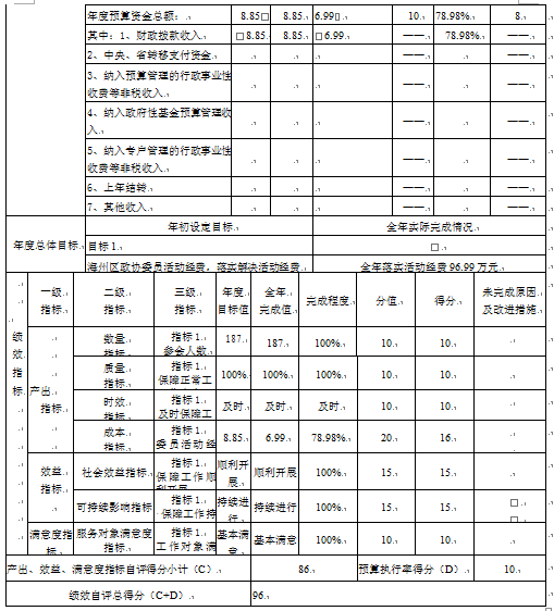 (2)“委员活动经费”项目自评综述:根据年初设定的绩效目标,项目自评得分96分。项目全年预算数为8.85万元,执行数为6.99万元,完成预算的78.98%。项目绩效目标完成情况:2021年度政协委员活动经费总目标8.85万元、年初预算数8.85万元,全年预计执行6.99万元,执行率78.98%。发现的主要问题及原因:各项制度措施不够完善。下一步改进措施:进一步加强和规范项目和资金管理,完善项目和资金使用。