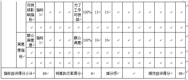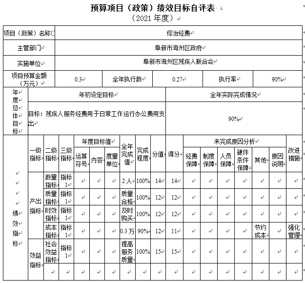 “综治经费”项目自评综述:根据年初设定的绩效目标,项目自评得分98分。项目全年预算数为0.3万元,执行数为0.27万元,完成预算的90%。项目绩效目标完成情况:一是主要用于残疾人服务经费。残联专项资金项目开展科学合理,项目管理规范,项目监管到位,运行保障有力,群众反映较好,社会经济效益显著。