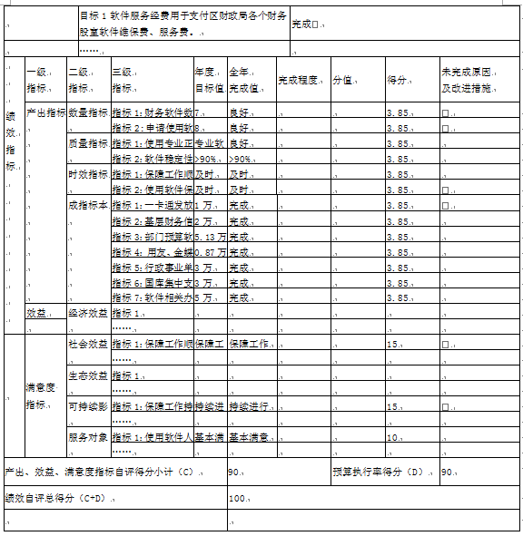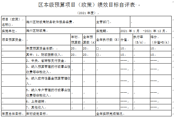 “海州区财政局财务软件服务经费”项目自评综述:根据年初设定的绩效目标,项目自评得分100分。项目全年预算数为20万元,执行数40.43万元,完成预算的202.2%。项目绩效目标完成情况:全部完成软件服务经费用于支付区财政局各个财务股室软件维保费、服务费。发现的主要问题及原因:原因主要是经费支出日常办公费用增加。下一步改进措施:压减支出。按规定调整下一年度预算金额,规范财政资金管理。