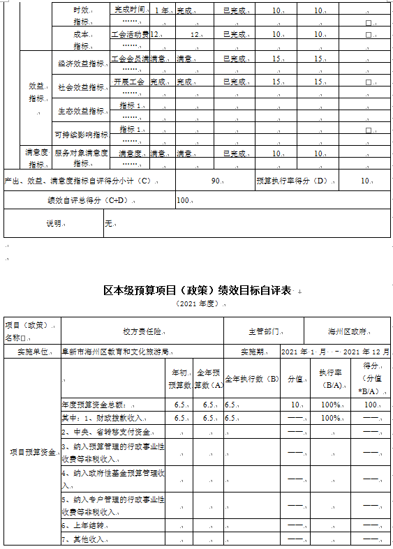(2)“工会经费”项目自评综述:根据年初设定的绩效目标,项目自评得分100分。项目全年预算数为12.00万元,执行数为12.00万元,完成预算的100%。项目绩效目标完成情况:一是完成工会经费拨付;二是完成工会活动开展;三是工会会员满意。发现的主要问题及原因:一是财务管理制度执行力偏弱;二是财务管理监督措施有待加强。下一步改进措施:一是加强资金预算编制;二是加强绩效管理分析。