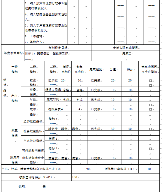 (4)“学校一键报警费”项目自评综述:根据年初设定的绩效目标,项目自评得分100分。项目全年预算数为4万元,执行数为4万元,完成预算的100%。项目绩效目标完成情况:一是一键报警公办校、园全覆盖;二是按时拨付一键报警经费;三是公办校、园满意。发现的主要问题及原因:一是财务管理制度执行力偏弱;二是财务管理监督措施有待加强。下一步改进措施:一是加强资金预算编制;二是加强绩效管理分析。