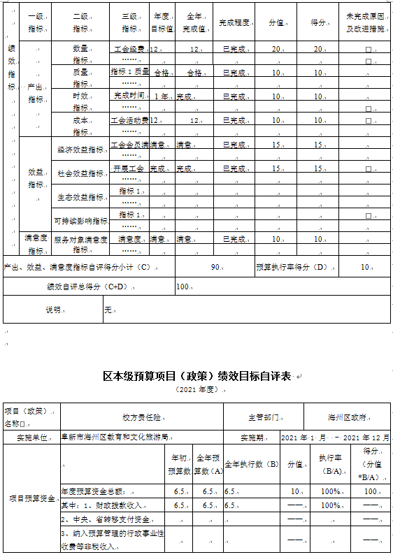 (2)“工会经费”项目自评综述:根据年初设定的绩效目标,项目自评得分100分。项目全年预算数为12.00万元,执行数为12.00万元,完成预算的100%。项目绩效目标完成情况:一是完成工会经费拨付;二是完成工会活动开展;三是工会会员满意。发现的主要问题及原因:一是财务管理制度执行力偏弱;二是财务管理监督措施有待加强。下一步改进措施:一是加强资金预算编制;二是加强绩效管理分析。