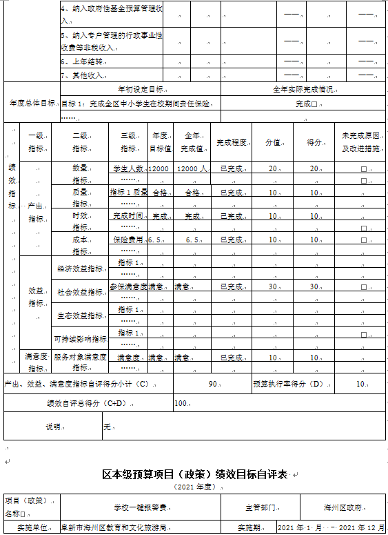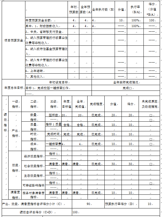(4)“学校一键报警费”项目自评综述:根据年初设定的绩效目标,项目自评得分100分。项目全年预算数为4万元,执行数为4万元,完成预算的100%。项目绩效目标完成情况:一是一键报警公办校、园全覆盖;二是按时拨付一键报警经费;三是公办校、园满意。发现的主要问题及原因:一是财务管理制度执行力偏弱;二是财务管理监督措施有待加强。下一步改进措施:一是加强资金预算编制;二是加强绩效管理分析。