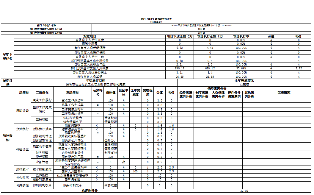 组织对1个单位开展整体绩效自评,涉及资金650.23万元,自评平均分32.02 分。《部门(单位)整体绩效自评表》见附件。