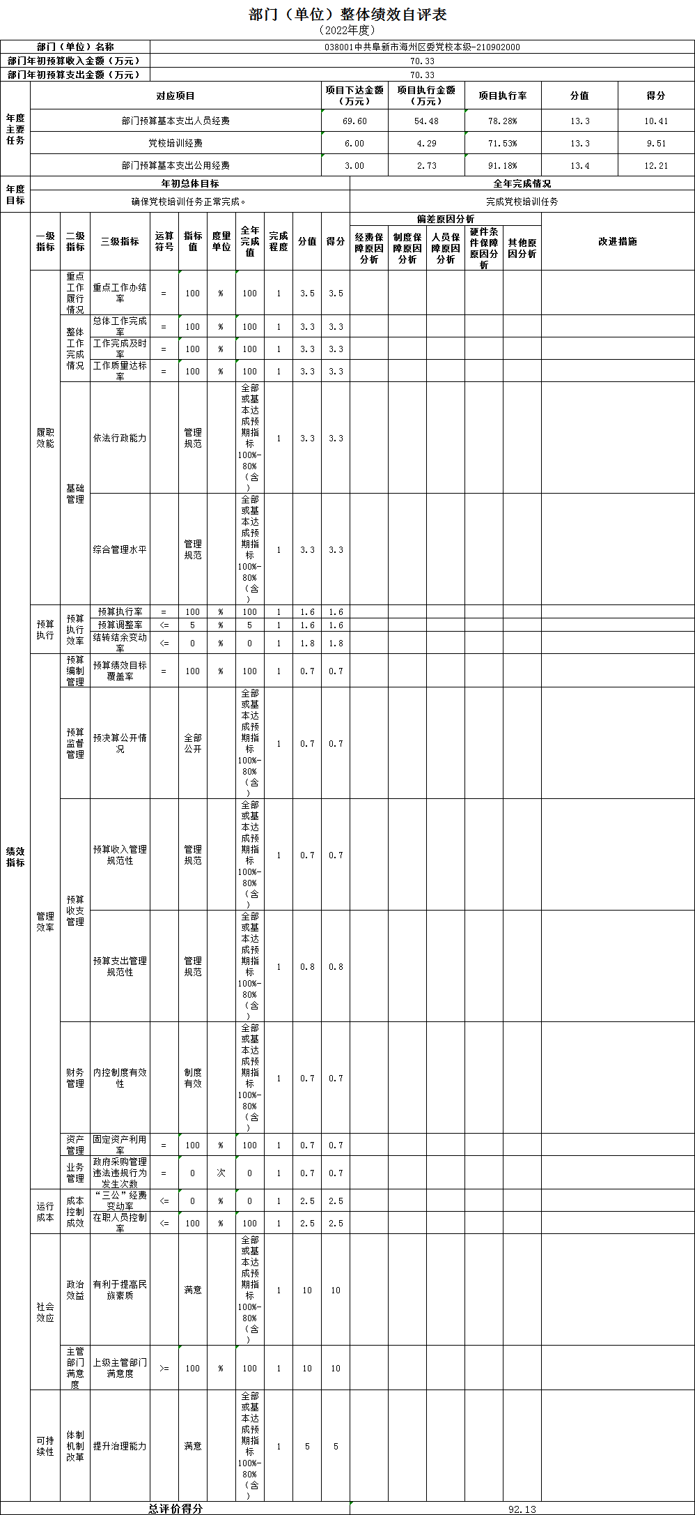 组织对1个单位开展整体绩效自评,涉及资金6万元,自评平均分92.13分。《部门(单位)整体绩效自评表》见附件。