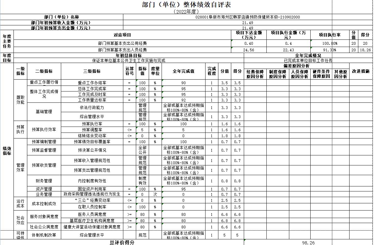 组织对1个单位开展整体绩效自评,涉及资金22.83万元,自评平均分98.26分。《部门(单位)整体绩效自评表》见附件。